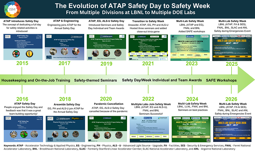 In 2015, under the leadership of Deputy Division Director for Operations Asmita Patel and Division Safety Coordinator Pat Thomas, ATAP first devoted an entire day to safety. It became a popular annual tradition, evolving into a feature-rich weeklong event that includes other Berkeley Lab divisions and national laboratories.