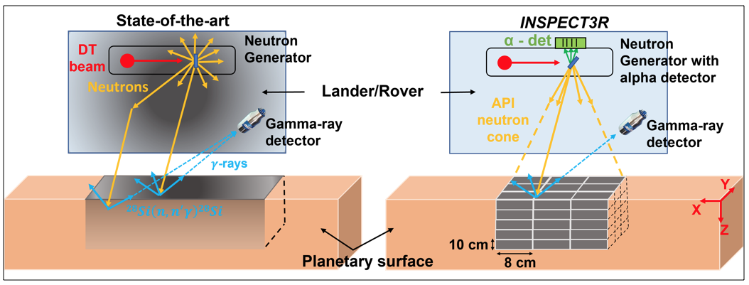 To overcome these limitations, INSPECT3R employs “an active spectrometer based on a technique called Associated Particle Imaging, or API, which uses neutrons and gamma rays to produce three-dimensional images with higher spatial resolution at depths beyond those attainable by GRNS,” says Ayllon Unzueta.