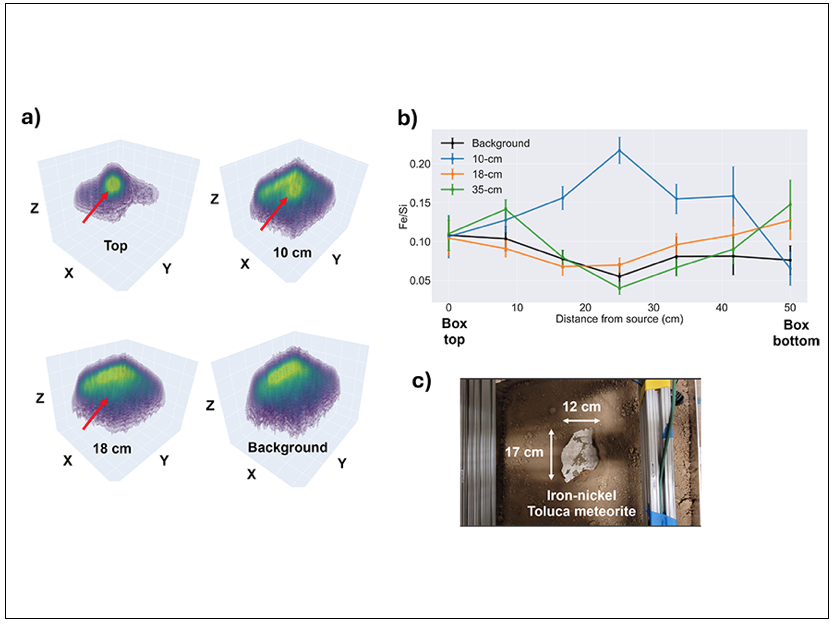 By placing an iron-nickel “Toluca” meteorite at different depths within a large aluminum box filled with soil, the team assessed its ability to locate and identify an object based on its elemental composition. After irradiation, the resulting 3D compositional maps showed the meteorite’s distinctive gamma-ray signatures with a resolution of 10 cm up to a depth of approximately 30 cm.