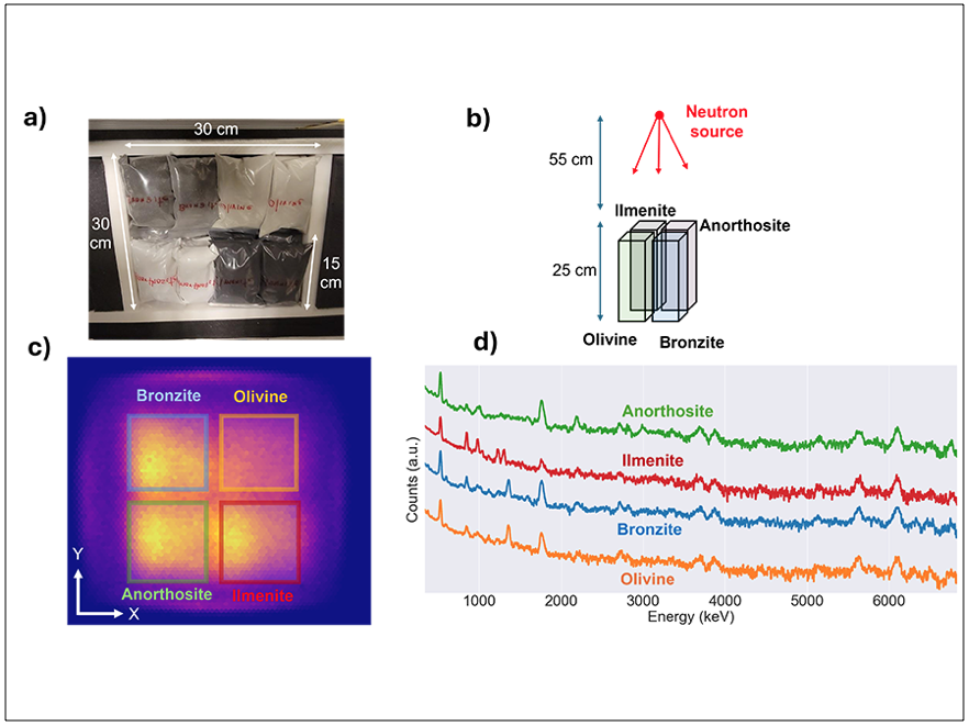 To evaluate the INPSECTR3’s ability to map the geochemical composition of a lunar surface, the researchers irradiated various lunar regolith simulants—terrestrial material that has been synthesized to approximate lunar soil. These samples were arranged next to each other to test the instrument’s horizontal resolution and stacked in layers to examine its depth resolution.