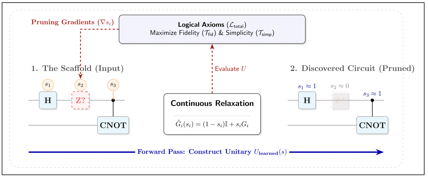 The DLP framework assigns each candidate gate in a scaffold a learnable parameter, which is then mapped to a continuous switch using a sigmoid function. This enables each gate to “relax” into a weighted interpolation between the identity matrix and the gate itself, making the entire circuit construction fully differentiable. The model pieces together the total sequence of these relaxed gates and trains to minimize a combined loss based on our chosen logical axioms, such as fidelity, simplicity, entanglement, and noise robustness.