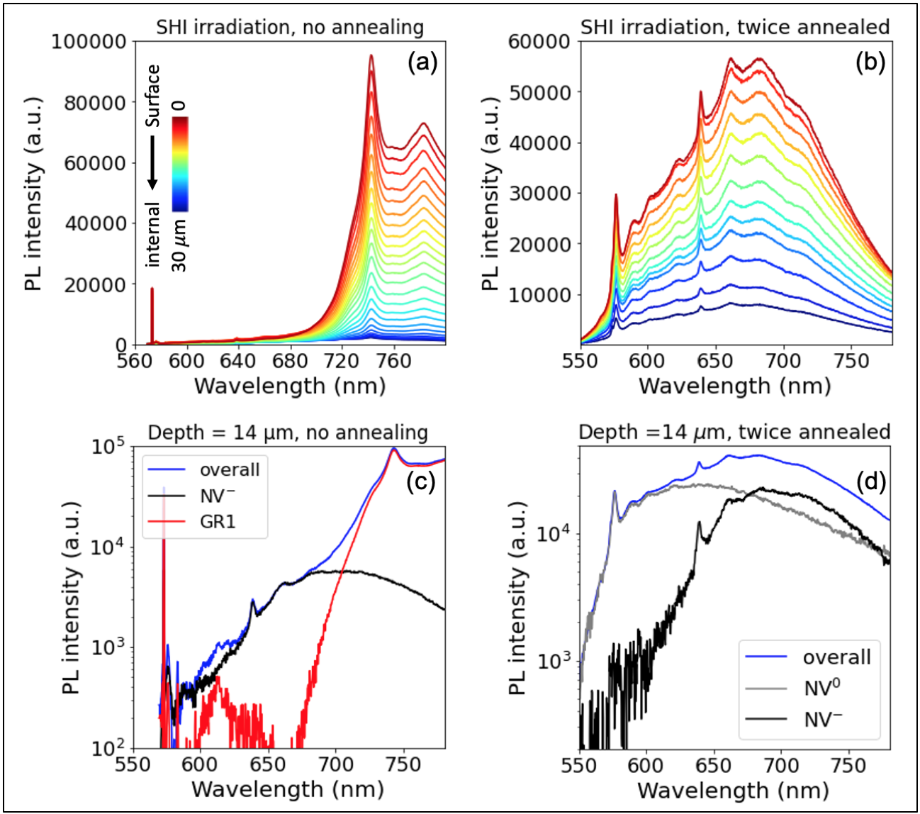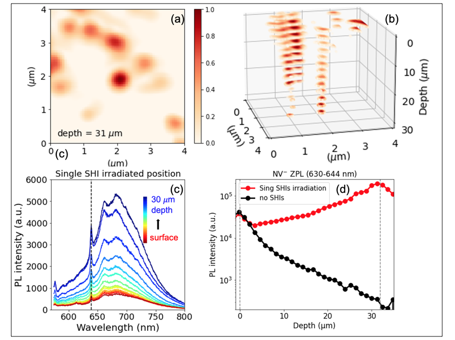 To create NV-centers in diamond, the researchers used the Universal Linear Accelerator at the Helmholtz Centre for Heavy Ion Research in Darmstadt, Germany, to direct 1-GeV gold and uranium ion beams onto a single-crystal nitrogen-doped diamond.