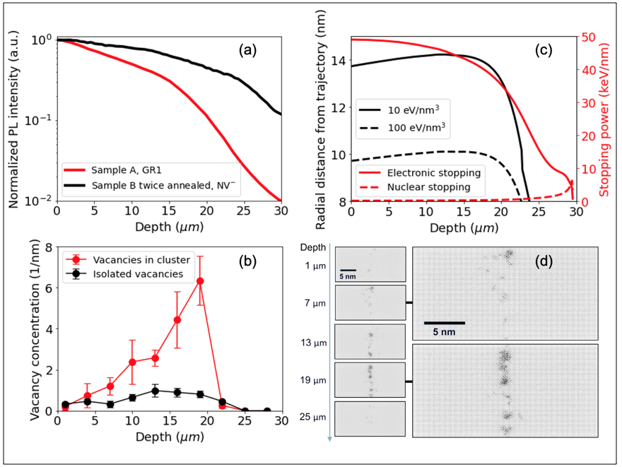 As these high-energy, heavy ions—known as swift heavy ions (SHI)—move through the diamond, the ion beams excite and ionize electrons in the lattice structure through a process called electronic stopping, which transfers energy to the lattice atoms. This rapid energy transfer causes atomic displacements, leading to vacancies formed along the SHI track.