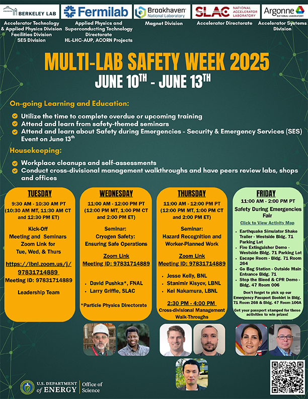 The 2025 Multi-Lab Safety Week featured expert presentations on important safety-related topics. We encourage you to review these slides and maintain the momentum throughout the year.