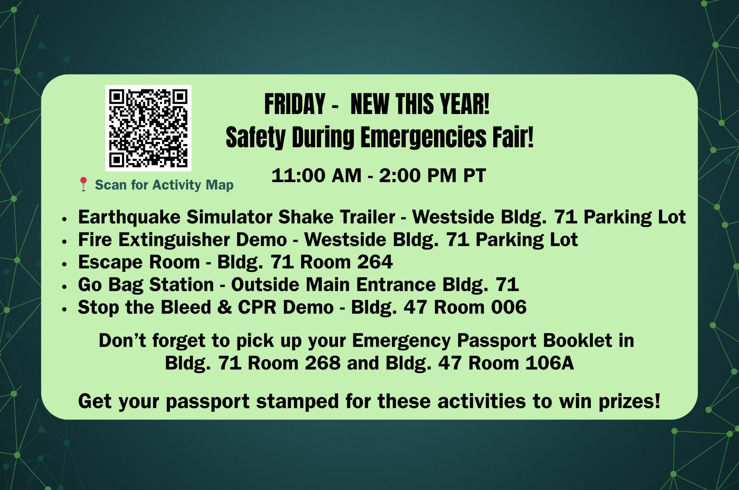 The Safety during Emergencies Fair was highly interactive and brought perspectives and advice from experts. A shake trailer allowed employees to experience a Richter 6.9 earthquake, similar to the Loma Prieta quake that struck the Bay Area in 1989. A go-bag station demonstrated how easy it is to be prepared with essentials when you have to move quickly and decisively. Hands-on demos of fire extinguisher use, cardiopulmonary resuscitation (CPR), the automated external defibrillator (AED), and the use of Stop the Bleed kits highlighted various preparedness measures. For engaging fun, a safety-themed escape room involved searching for clues. A passport stamped at each of these stations made participants eligible for prizes.