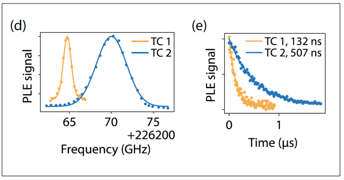 The optical-linewidth broadening of T centers. The (d) photoluminescence-excitation (PLE) spectra and (e) cavity-enhanced lifetimes of two T centers under study.