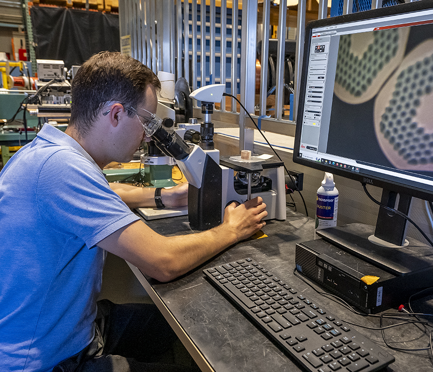 A BCMT researcher examines the microstructure of a multifilamentary superconducting wire. Our “from melt to magnet” understanding of superconducting technology has been vital to progress.