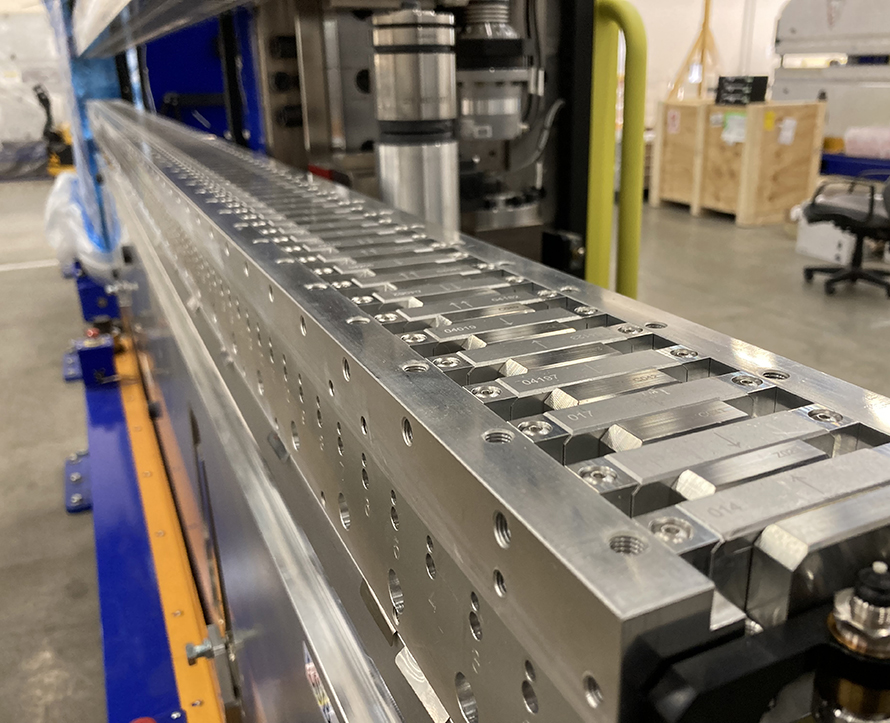 An undulator for LCLS-II HE shows the alternation of permanent-magnet blocks (with arrows) and pole pieces, as well as the massive machinery needed to make the gap between the upper and lower magnet arrays both precisely and reproducibly variable. (Photo courtesy Philip Mallon.)