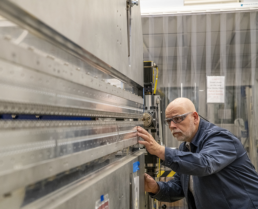 Tom Lipton performs checks on an LCLS-II undulator. The electron beam passes along the length of the device through the gap in the middle. The alternating-polarity blocks of powerful permanent magnets wring photons out of the electron beam in a way that forms intense beams of X-rays for user experiments.