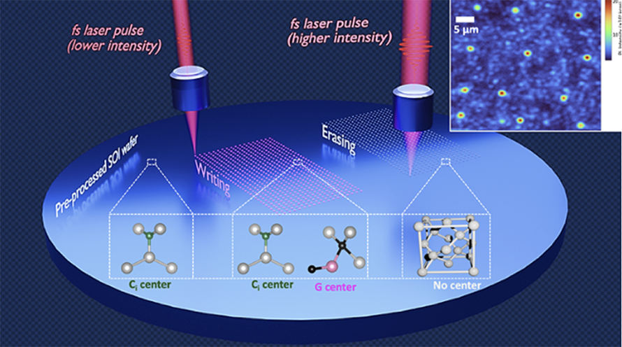 An artistic depiction of a new method to create high-quality color centers (qubits) in silicon at specific locations using ultrafast laser pulses (femtosecond, or one quadrillionth of a second). The inset at the top-right shows an experimentally observed optical signal (photoluminescence) from the qubits, with their structures displayed at the bottom.